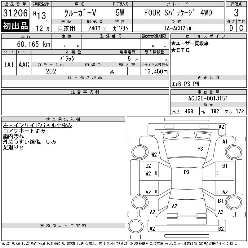 Toyota KLUGER с аукциона Японии CAA Tokyo лот № 31206