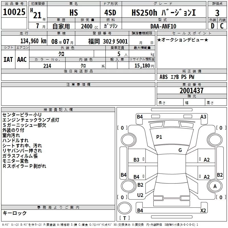 Lexus HS с аукциона Японии TAA Kyushu лот № 10025