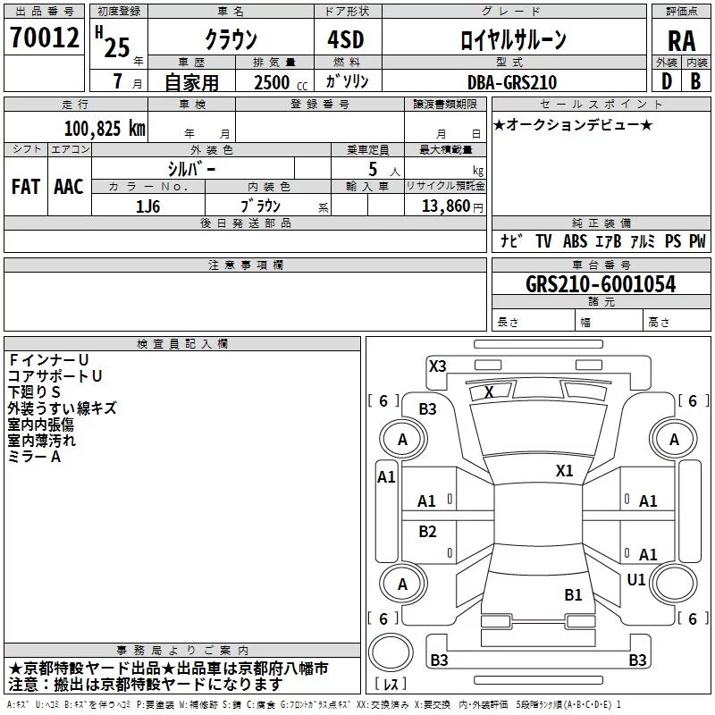 Toyota CROWN с аукциона Японии TAA Kinki лот № 70012