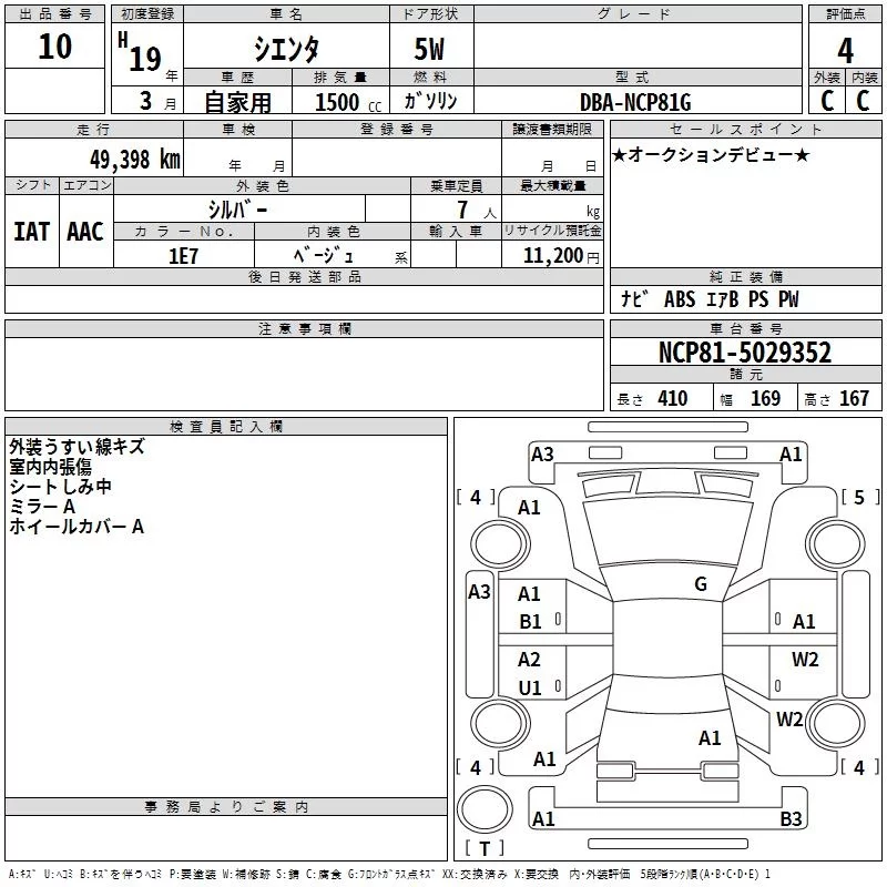 Toyota SIENTA с аукциона Японии TAA Kinki лот № 10