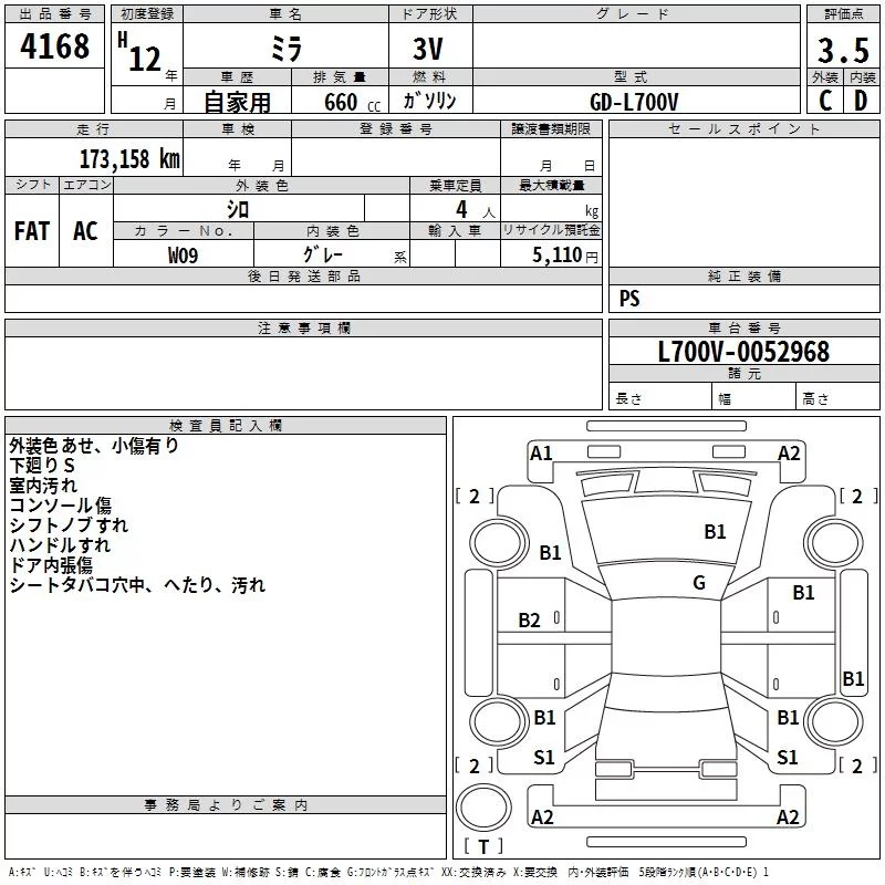 Daihatsu MIRA с аукциона Японии TAA Shikoku лот № 4168