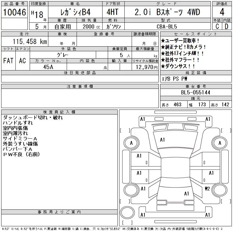 Subaru LEGACY B4 с аукциона Японии CAA Tokyo лот № 10046