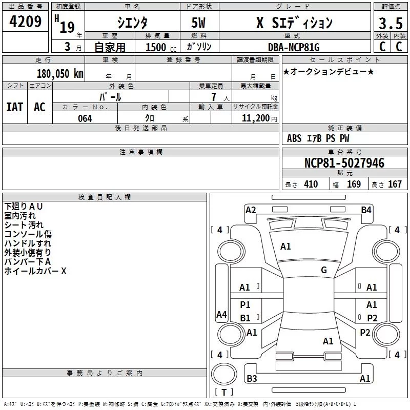 Toyota SIENTA с аукциона Японии TAA Shikoku лот № 4209