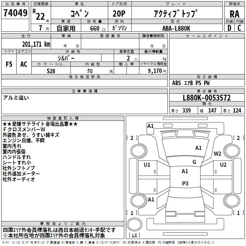 Daihatsu Copen с аукциона Японии TAA Shikoku лот № 74049