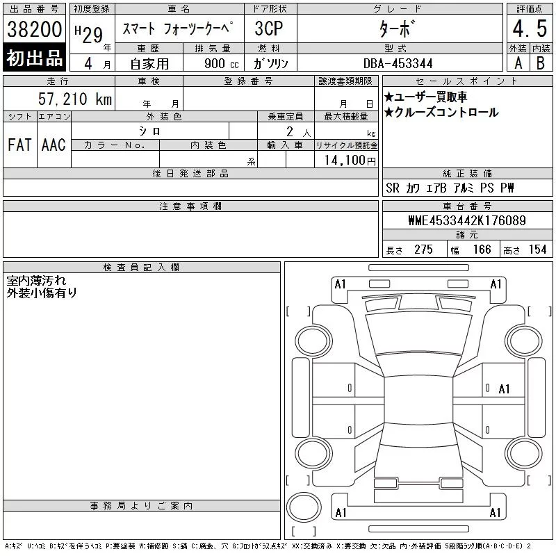 Smart FORTWO с аукциона Японии CAA Tokyo лот № 38200