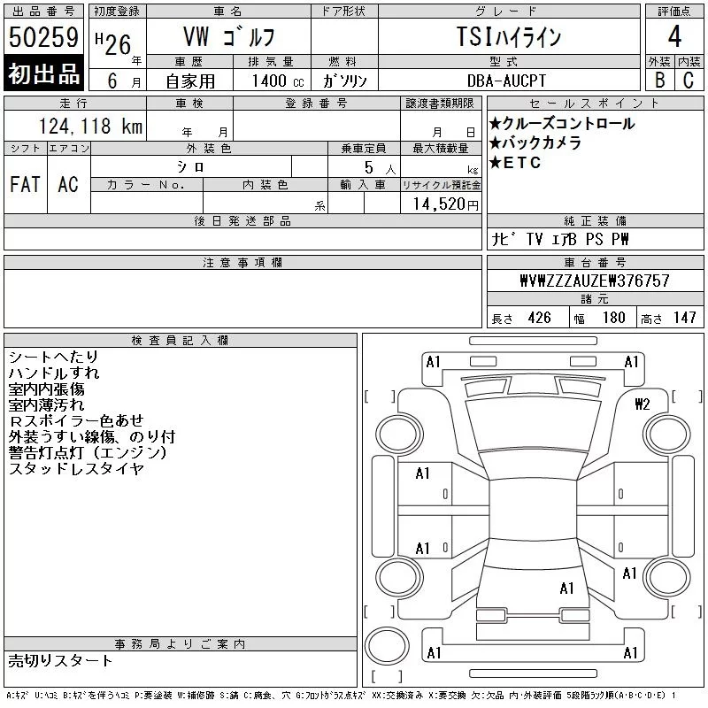 Volkswagen Golf с аукциона Японии CAA Tokyo лот № 50259