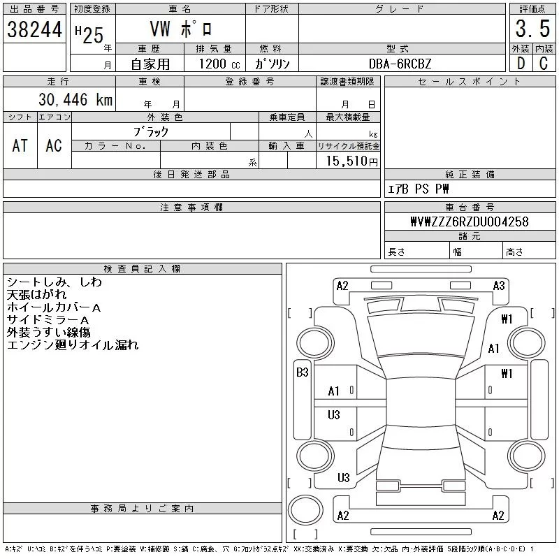 Volkswagen Polo с аукциона Японии CAA Tokyo лот № 38244