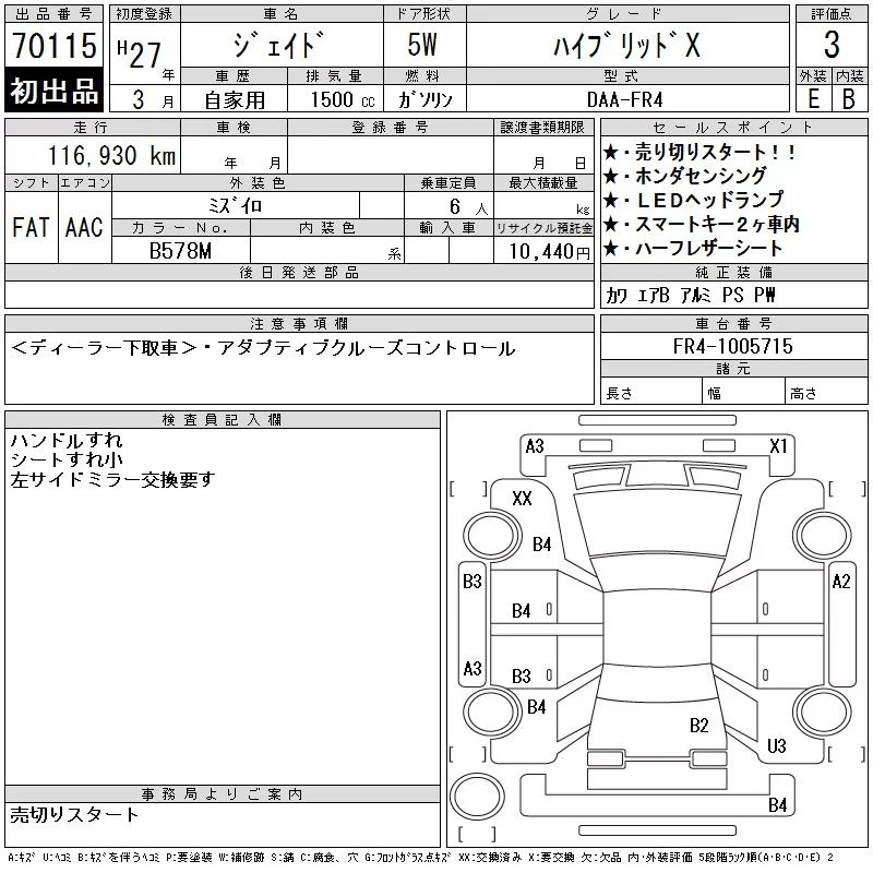 Honda JADE с аукциона Японии CAA Gifu лот № 70115