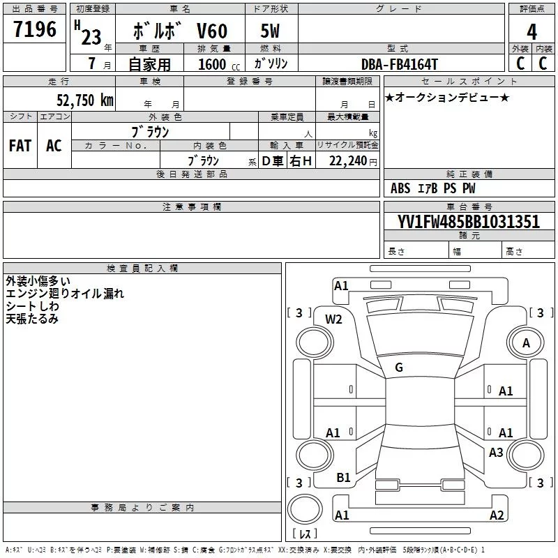 Volvo V60 с аукциона Японии TAA Kinki лот № 7196