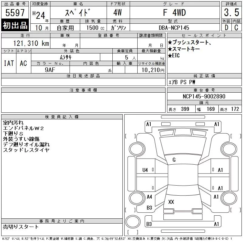 Toyota SPADE с аукциона Японии CAA Tohoku лот № 5597