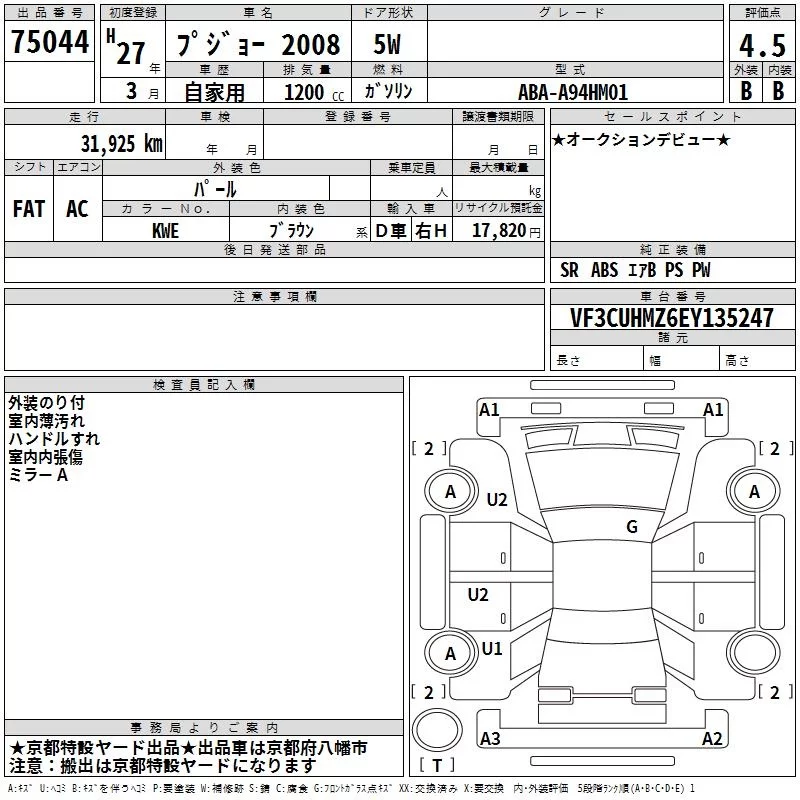 Peugeot 2008 с аукциона Японии TAA Kinki лот № 75044