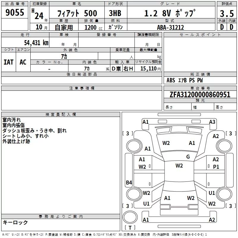 Fiat 500 с аукциона Японии TAA Minami Kyushu лот № 9055