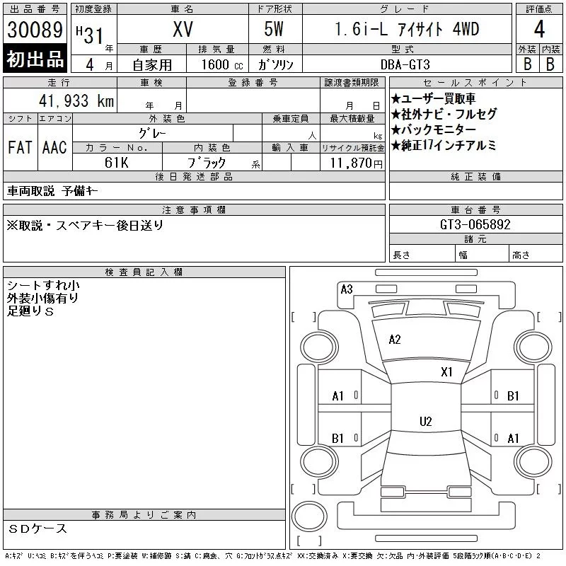 Subaru XV с аукциона Японии CAA Gifu лот № 30089