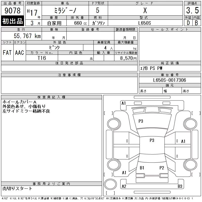 Daihatsu MIRA с аукциона Японии CAA Chubu лот № 9078