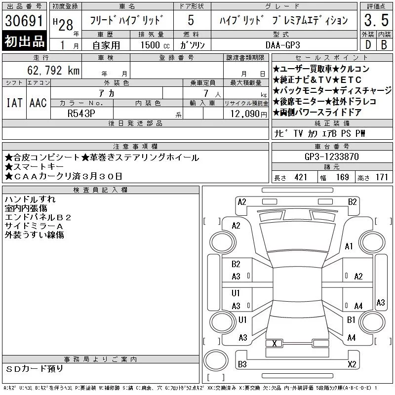 Honda FREED с аукциона Японии CAA Chubu лот № 30691