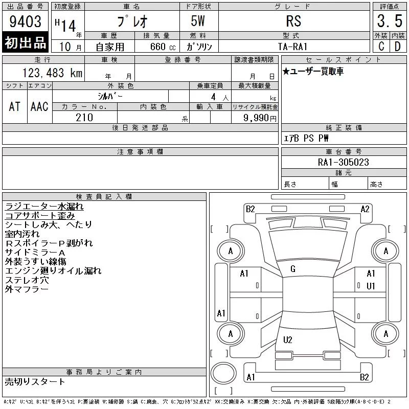 Subaru PLEO с аукциона Японии CAA Chubu лот № 9403