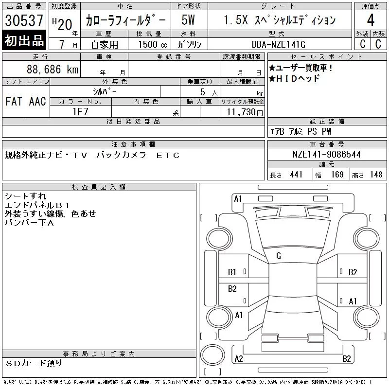 Toyota COROLLA FIELDER с аукциона Японии CAA Chubu лот № 30537