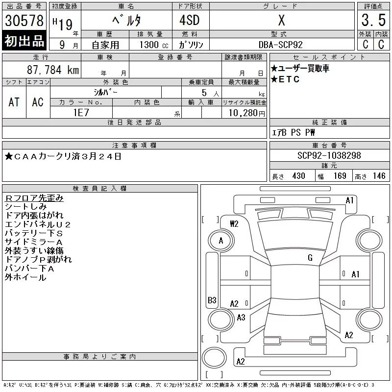 Toyota BELTA с аукциона Японии CAA Chubu лот № 30578
