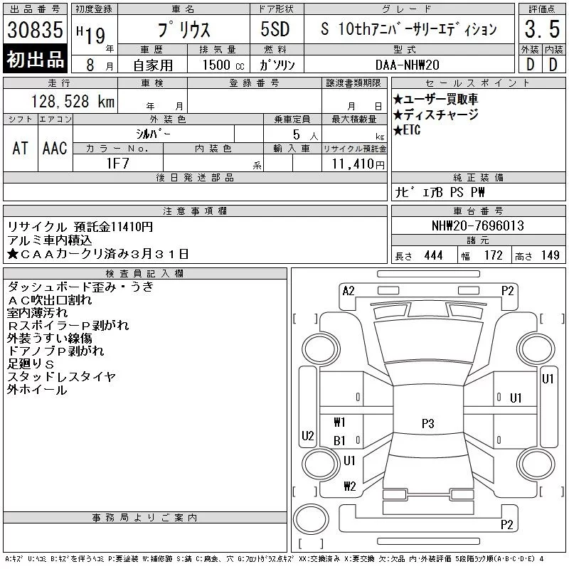 Toyota Prius с аукциона Японии CAA Chubu лот № 30835