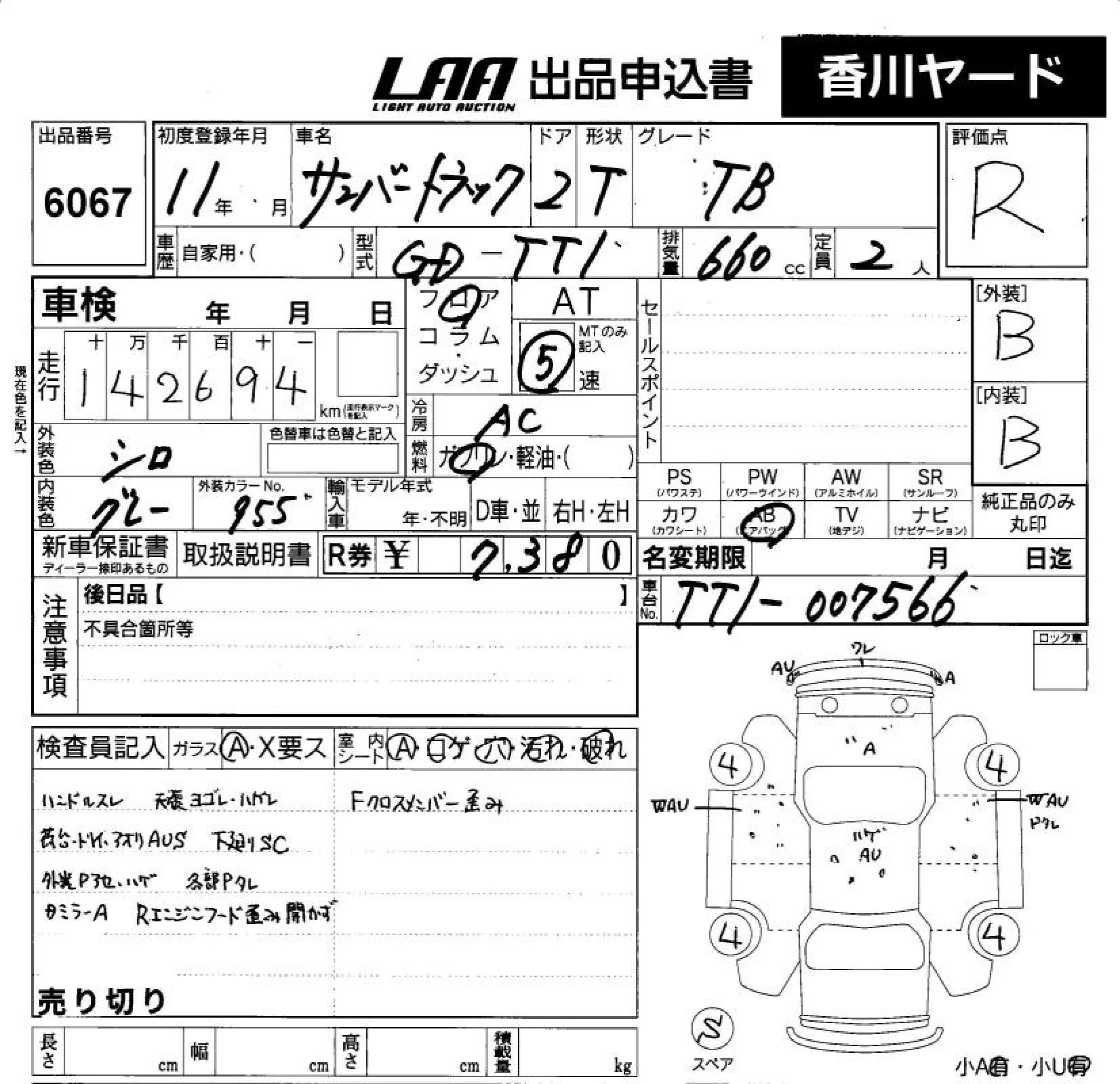 Subaru SAMBAR с аукциона Японии LAA Shikoku лот № 6067