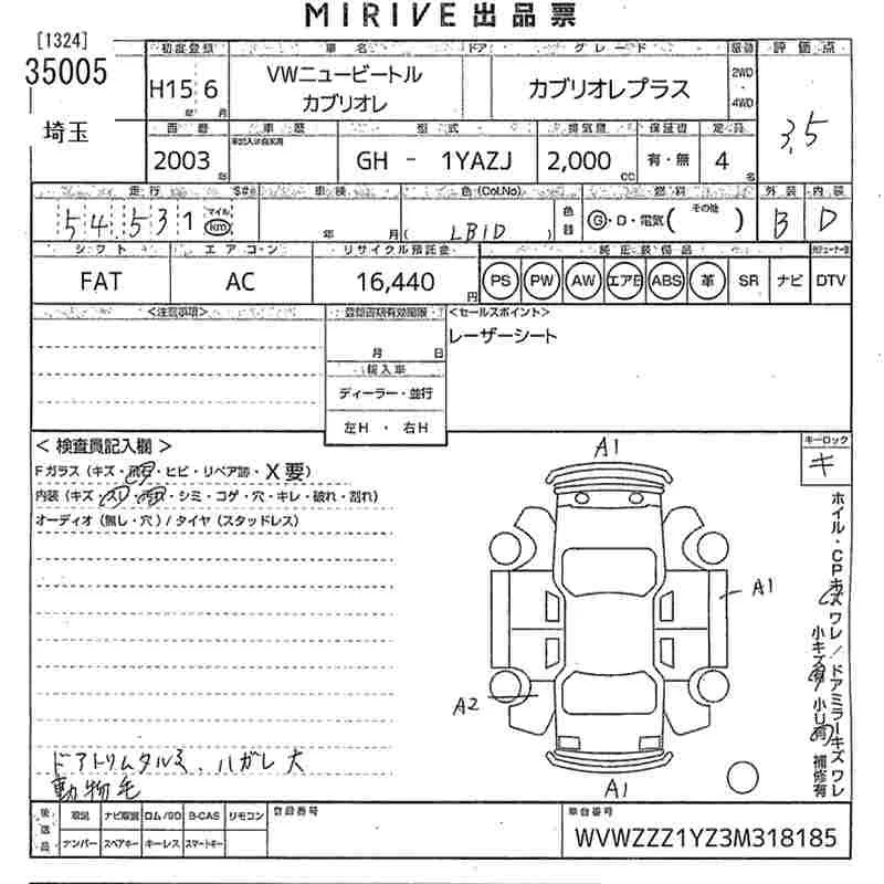 Volkswagen NEW BEETLE с аукциона Японии MIRIVE Saitama лот № 35005
