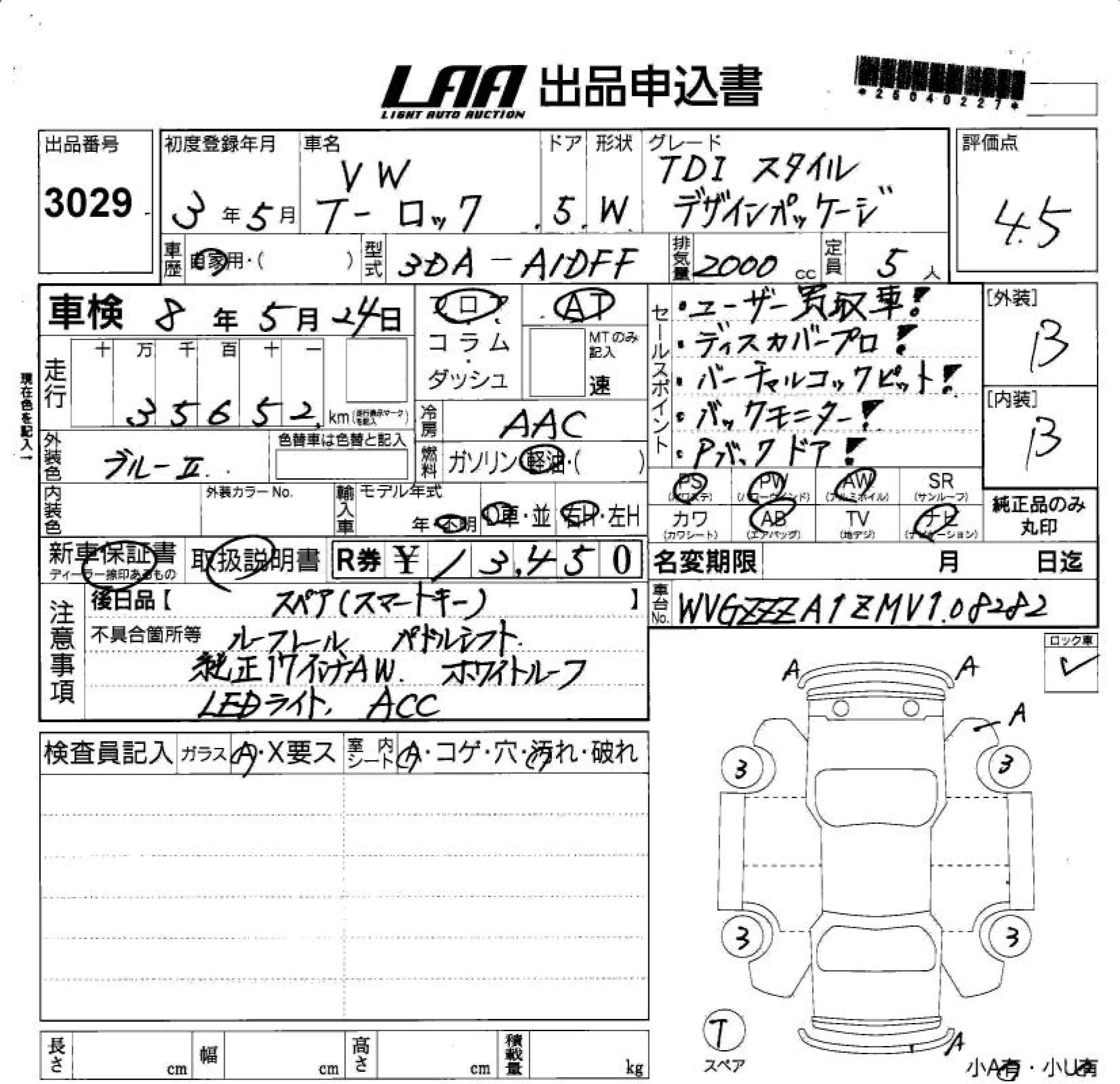 Volkswagen T-ROC с аукциона Японии LAA Shikoku лот № 3029