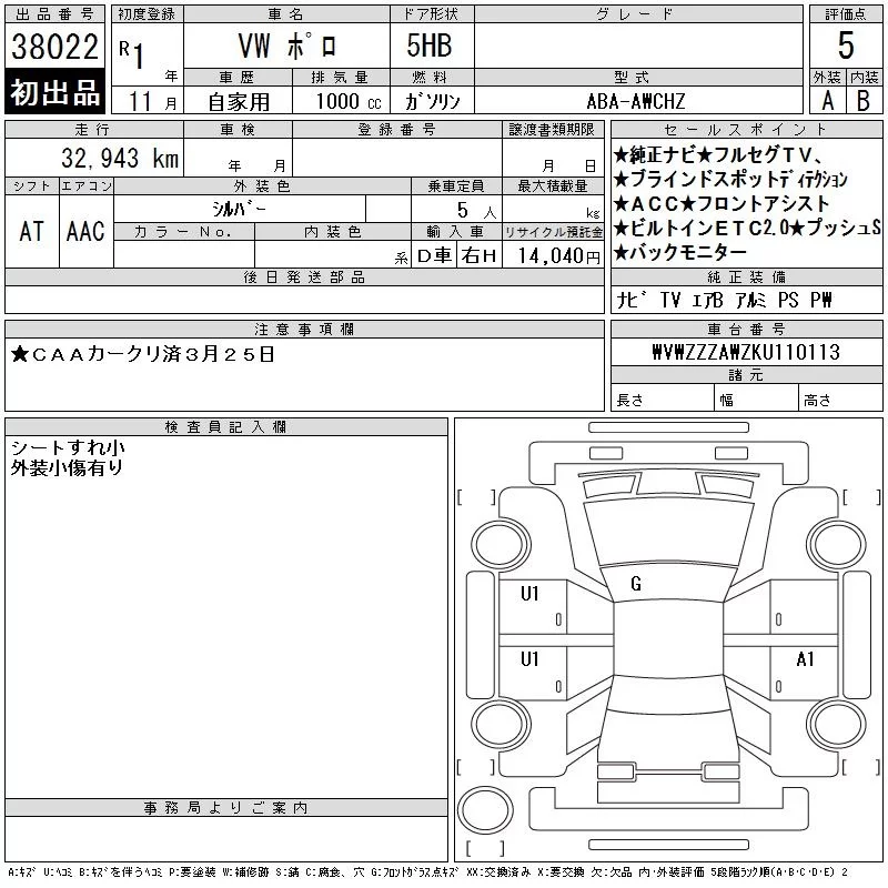 Volkswagen Polo с аукциона Японии CAA Chubu лот № 38022