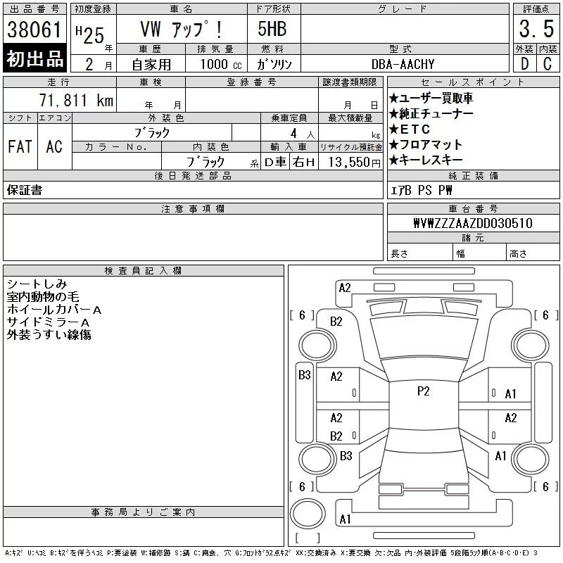 Volkswagen UP с аукциона Японии CAA Chubu лот № 38061