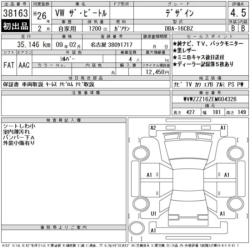 Volkswagen THE BEETLE с аукциона Японии CAA Chubu лот № 38163