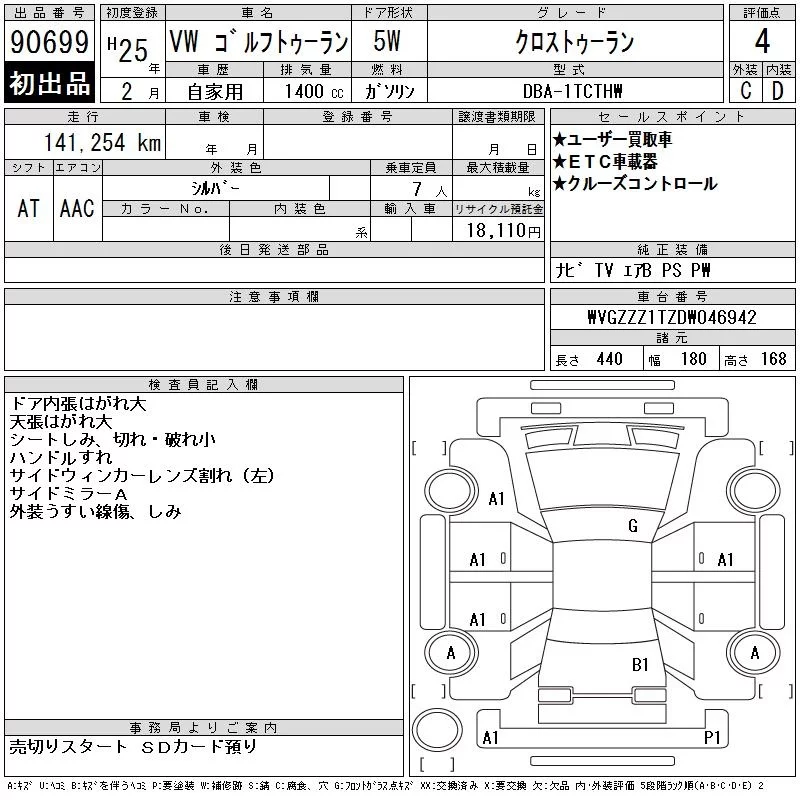 Volkswagen GOLF TOURAN с аукциона Японии CAA Chubu лот № 90699