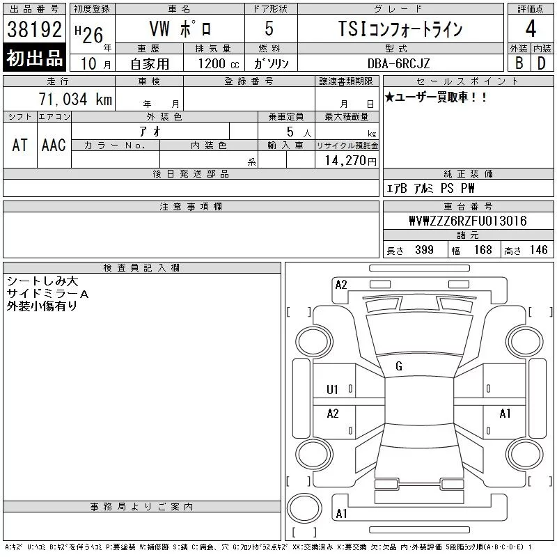 Volkswagen Polo с аукциона Японии CAA Chubu лот № 38192