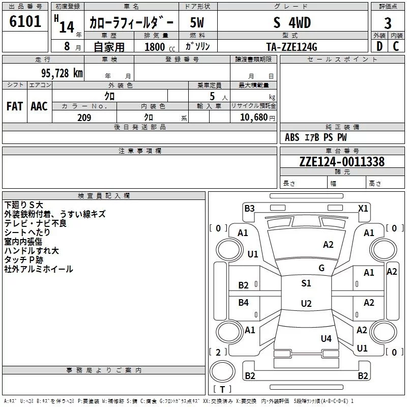 Toyota COROLLA FIELDER с аукциона Японии TAA Hokkaido лот № 6101