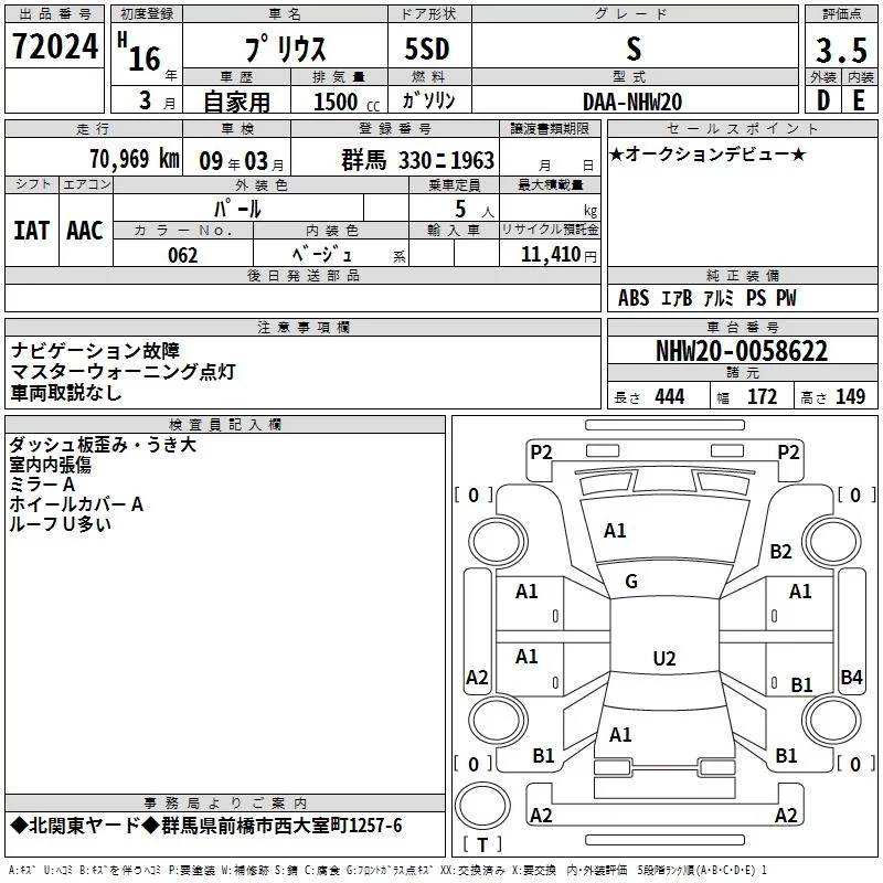 Toyota Prius с аукциона Японии TAA Kanto лот № 72024