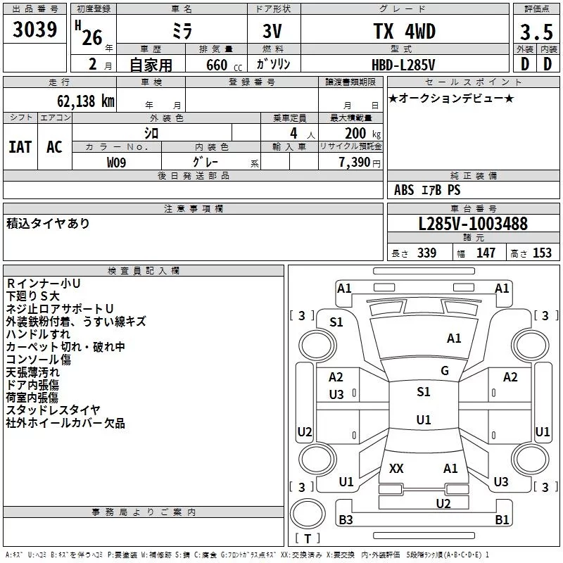 Daihatsu MIRA с аукциона Японии TAA Hokkaido лот № 3039