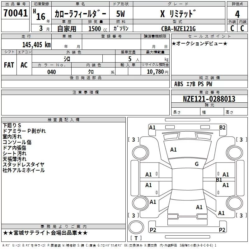 Toyota COROLLA FIELDER с аукциона Японии TAA Tohoku лот № 70041