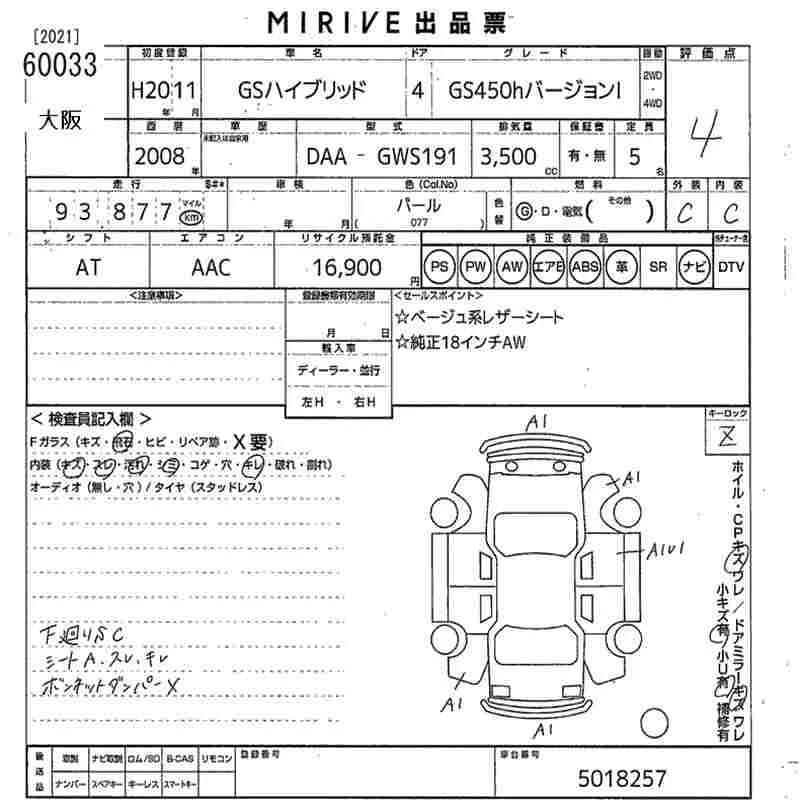 Lexus GS с аукциона Японии MIRIVE Osaka лот № 60033