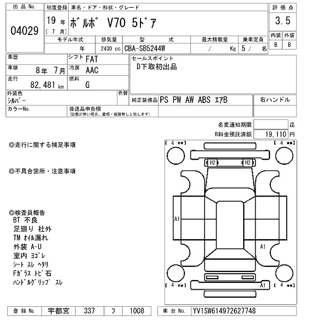 Volvo V70 с аукциона Японии ARAI Oyama лот № 4029