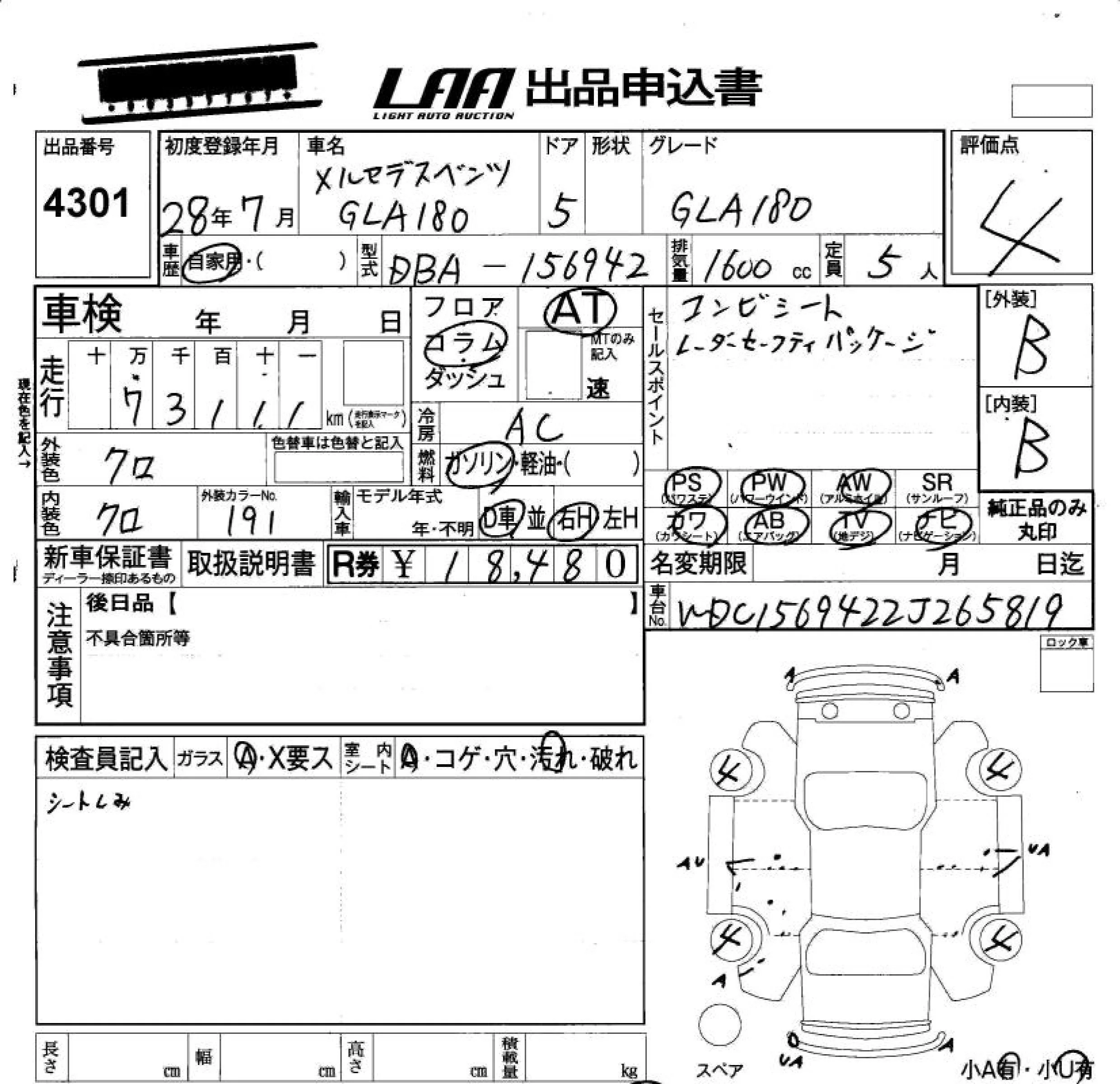 Mercedes-Benz GLA CLASS с аукциона Японии LAA Okayama лот № 4301