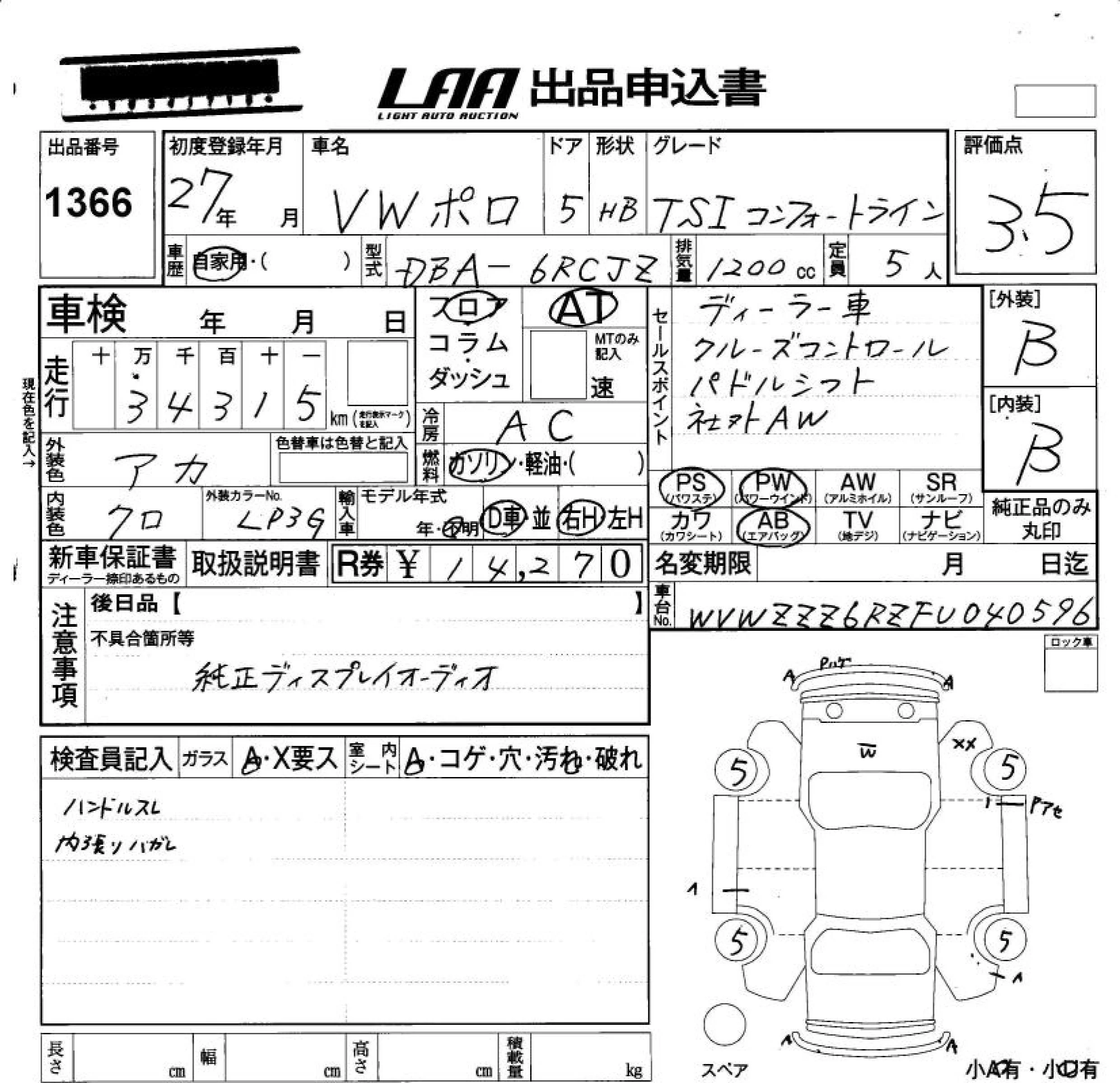Volkswagen Polo с аукциона Японии LAA Okayama лот № 1366