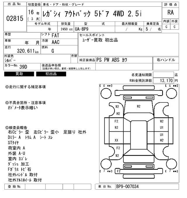 Subaru LEGACY OUTBACK с аукциона Японии ARAI Bayside лот № 2815