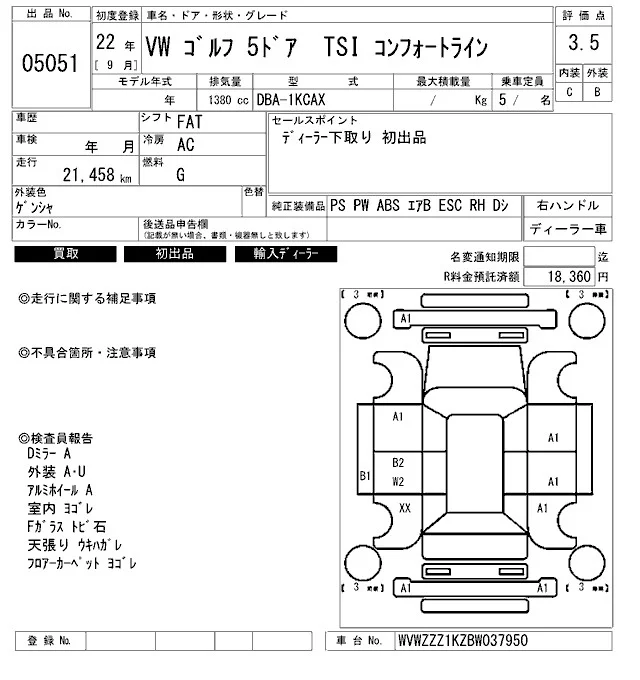 Volkswagen Golf с аукциона Японии ARAI Bayside лот № 5051