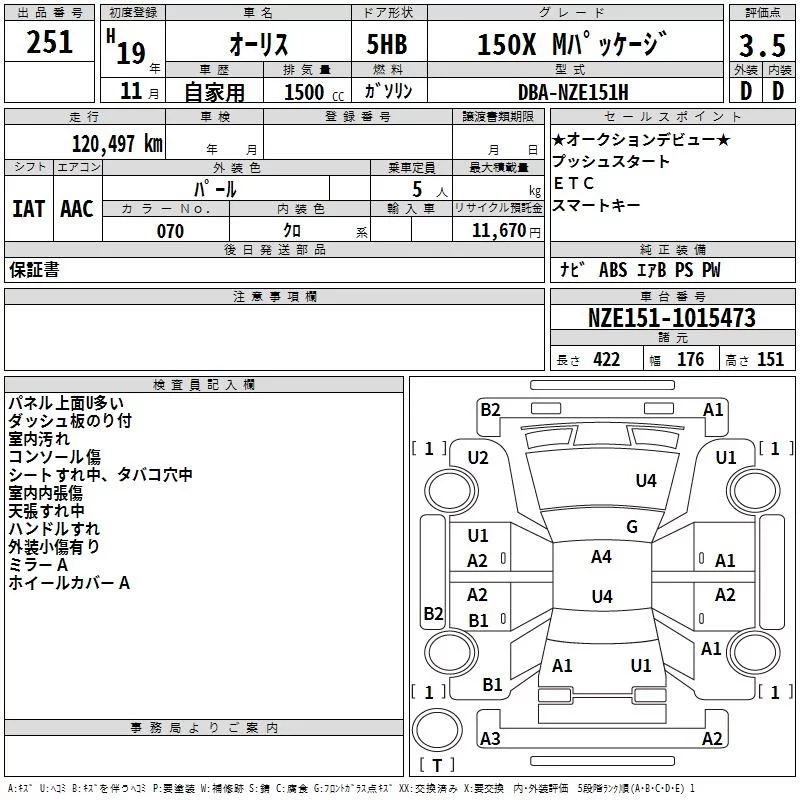 Toyota AURIS с аукциона Японии TAA Hyogo лот № 251