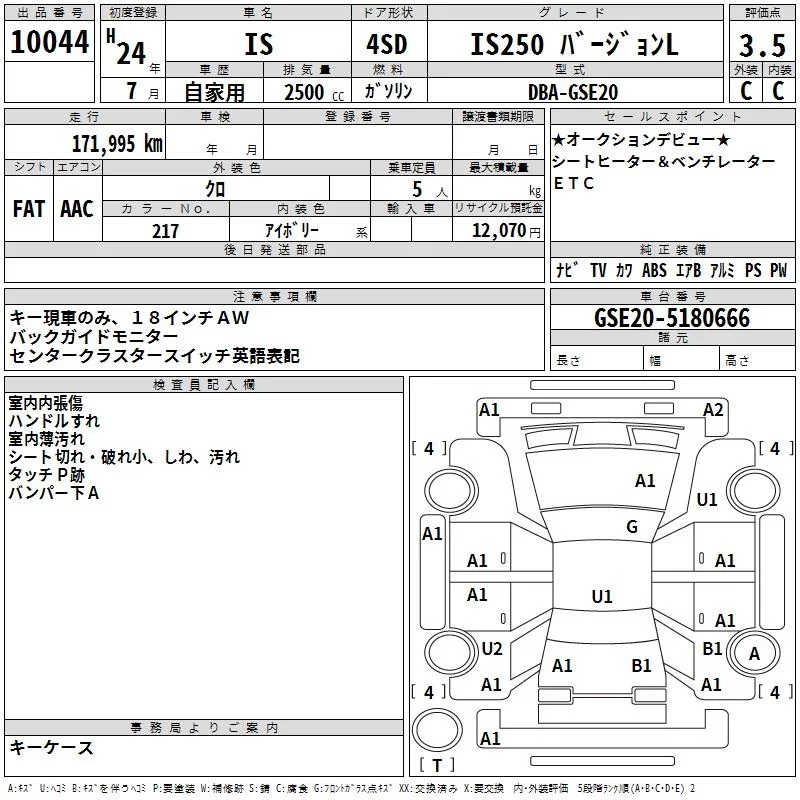 Lexus IS с аукциона Японии TAA Yokohama лот № 10044